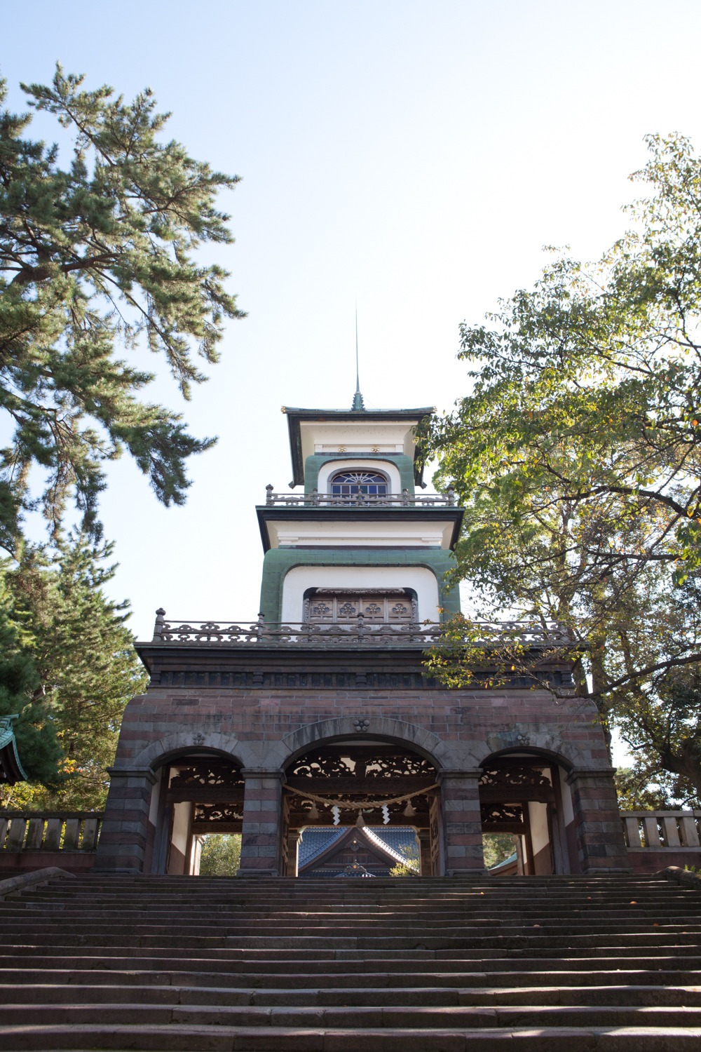 前田利家公と正室・お松の方を祀る神社。全国的にも珍しい、和漢洋のスタイルが融合した「神門」の最上階にはオランダ製のステンドグラスがはめ込まれ、夜には明かりが灯る金沢のシンボルとして親しまれています。